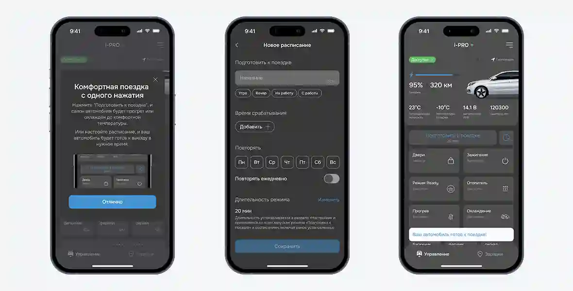 Добавлена новая функция, актуальная к началу холодного сезона: «Подготовка к поездке» с возможностью планирования. С помощью нее возможно настроить расписание, оформленное в привычном виде будильника смартфона, которое включит климат-контроль, а также обогрев тяговой батареи в указанный момент времени. В случае, если электрокар оснащен автономным отопителем, который рекомендован производителем и опционально устанавливается официальными дилерами, он будет использоваться для подготовки к поездке, сохраняя заряд тяговой батареи.