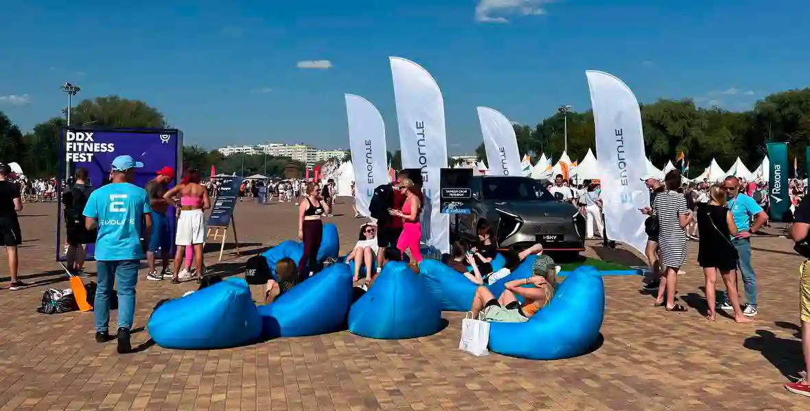 В бренд-зоне EVOLUTE можно было насладиться атмосферой феста, зарядить свои гаджеты и приятно отдохнуть, прямо как в уютном салоне электрокара EVOLUTE.