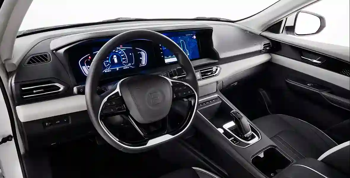 Дизайн EVOLUTE i‑PRO не назовешь ультрасовременным. Его кузовные линии, особенно если смотреть в профиль, напоминают о близких «родственниках» — Dongfeng Aeolus E70, Nissan Sylphy и Nissan Almera третьего поколения. Причем последний, как известно, выпускали на АВТОВАЗе с 2012 по 2018 год. Однако все кузовные панели i‑PRO оригинальные, а фронтальная часть радикально переоформлена. Здесь появились светодиодные ДХО, галогеновая оптика современного кроя и крупный лючок зарядки с комбинированным коннектором, позволяющим пользоваться как медленной зарядкой Type 2 (с переменным током), так и быстрой CCS2 (с постоянным током). Природолюбивую сущность липчанина выдают также глухая фальшрадиаторная решетка и «аэродинамические» колесные диски со спицами, прикрывающими дисковые тормозные механизмы.