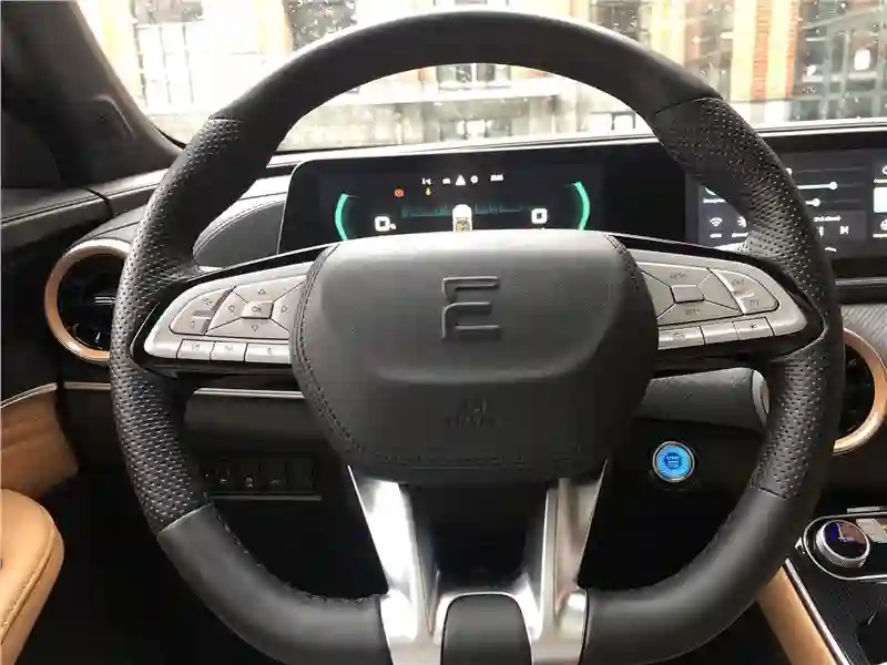 В салоне тестовой машины – сочетание кожзама абрикосового цвета и темного пластика с вставками под алюминий. Материалы недорогие, но благодаря грамотному цветовому сочетанию выглядят дорого. Два одинаковых по размеру экрана, 10,25-дюймовых – приборная панель и экран мультимедиа в центре передней панели. Есть Bluetooth, нет CarPlay и Android Auto, но можно «зеркалить» экран смартфона через приложение Carbitlink. Немного странно смотрится панорамная крыша c эффектом «звездное небо» – днем, когда солнцезащитная шторка открыта. Кажется, к стеклу крыши снаружи прилипло что-то, вроде звездочек от детской хлопушки.
